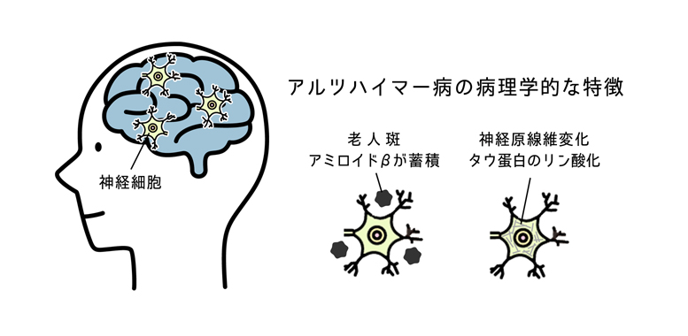 アルツハイマー病の病理学的な特徴は、大脳皮質や海馬の神経細胞の脱落と細胞外に沈着するアミロイドβ(老人斑)です。このアミロイドβが脳に沈着することがアルツハイマー病の最も重要な原因と考えられています。